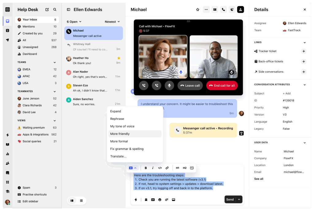 The platform emphasizes chatbot UX by blending automation with human agents seamlessly. It excels at conversational flows that guide users through product education and issue resolution.